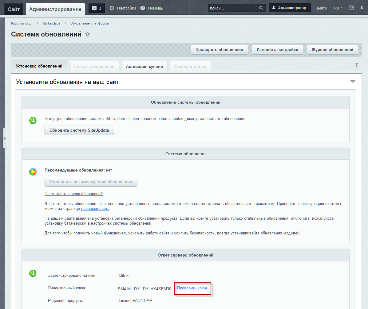 Также с помощью формы вы можете активировать вашу копию продукта «1С-Битрикс», если ваш лицензионный ключ ранее не был активирован.