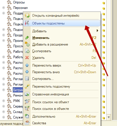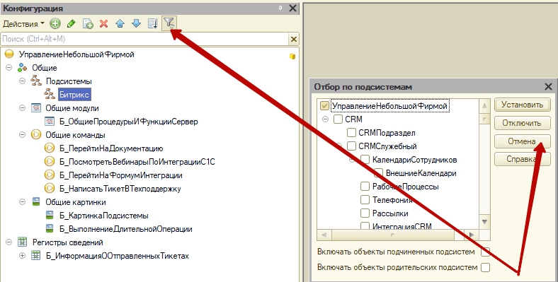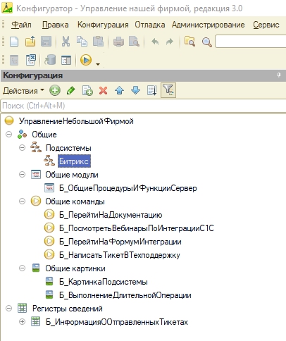 Открываем конфигуратор и делаем отбор по подсистеме "Битрикс".