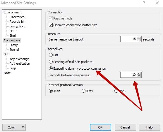 В открывшихся свойствах соединения нужно выбрать раздел "Connection" (Подключение) и там же в пункте "Keepalives" (Поддерживать активность), отметить "Executing dummy protocol commands" (Пустые команды протокола), и задать значение "Seconds between keepalives" (Секунд между сообщениями) – например, 10.