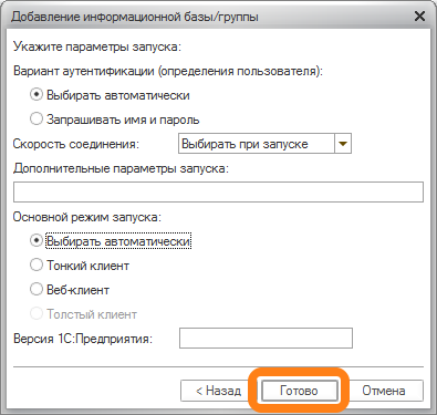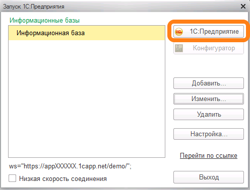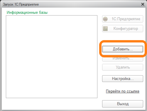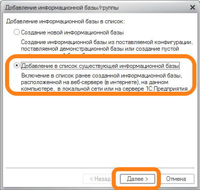 - Выберите пункт "Добавление в список существующей информационной базы"