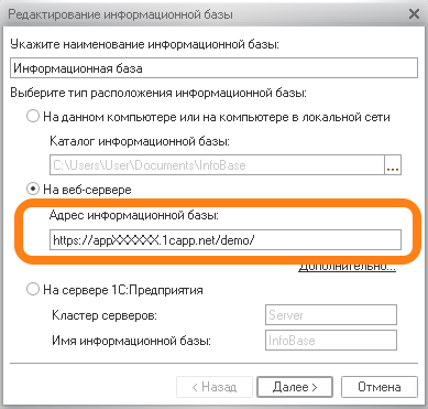 - Выберите пункт "Веб-сервер" и введите адрес информационной базы, развернутой в 1С:ГРМ. Затем нажмите кнопку "Далее".
