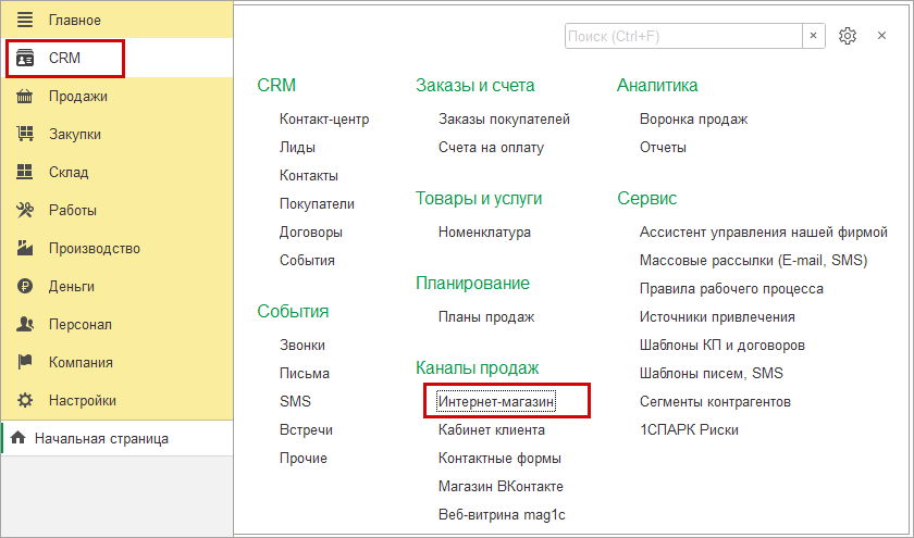 Все операции по обменам с сайтами теперь доступны по ссылке Интернет-магазин в разделе CRM.